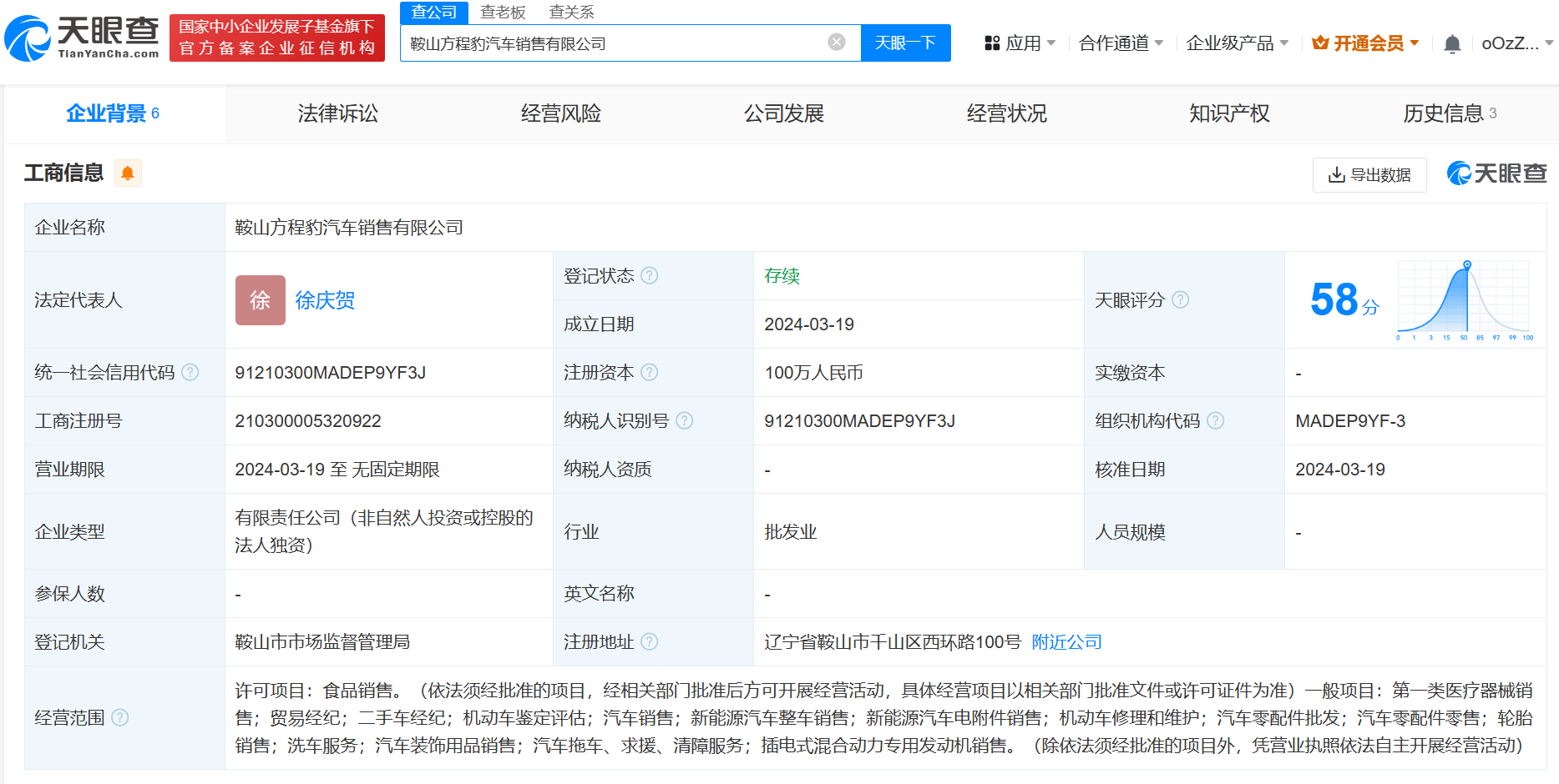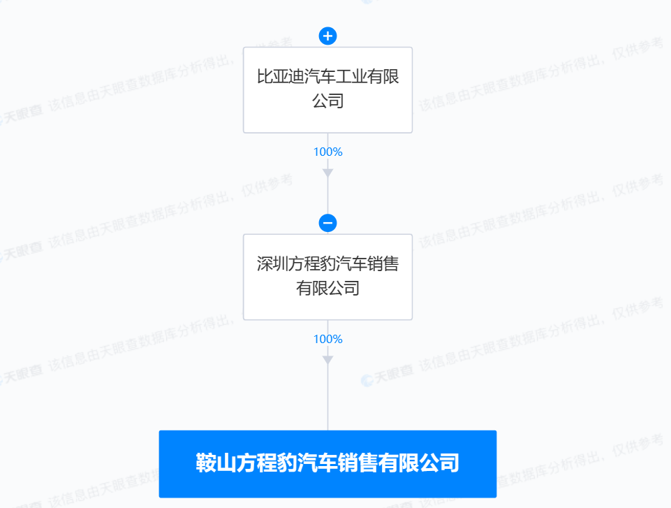 天眼查App显示,近日,鞍山方程豹汽车销售有限公司成立,法定代表人为徐庆贺,注册资本100万人民币,经营范围含贸易经纪、二手车经纪、新能源汽车整车销售、汽车零配件零售、插电式混合动力专用发动机销售等。股权全景穿透图显示,该公司由深圳方程豹汽车销售有限公司全资持股,后者为比亚迪汽车工业有限公司全资子公司。