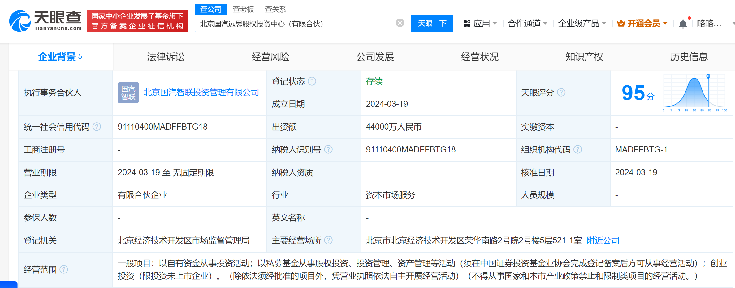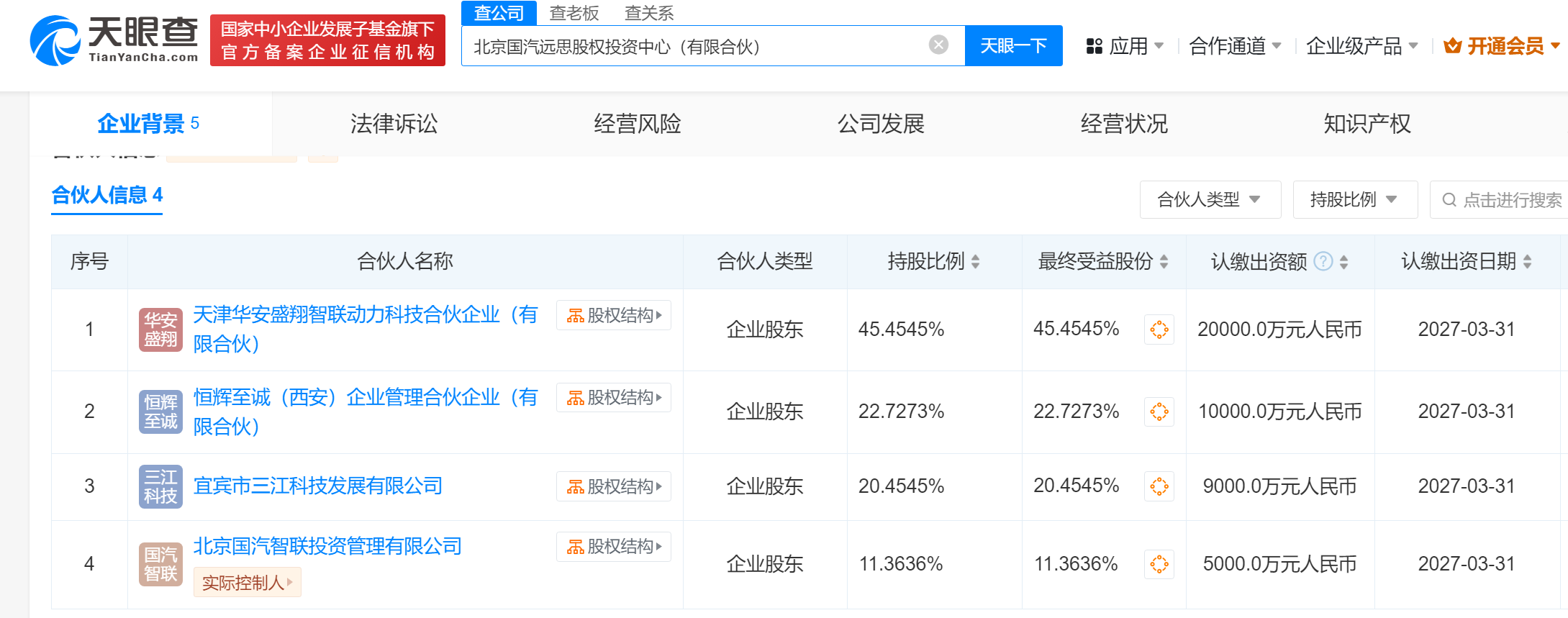 天眼查App显示,近日,北京国汽远思股权投资中心(有限合伙)成立,执行事务合伙人为北京国汽智联投资管理有限公司,出资额4.4亿人民币,经营范围为以自有资金从事投资活动,以私募基金从事股权投资、投资管理、资产管理等活动,创业投资。合伙人信息显示,该企业由天津华安盛翔智联动力科技合伙企业(有限合伙)、恒辉至诚(西安)企业管理合伙企业(有限合伙)、宜宾市三江科技发展有限公司、北京国汽智联投资管理有限公司共同出资。