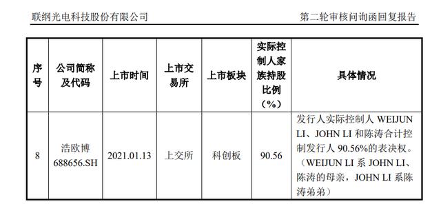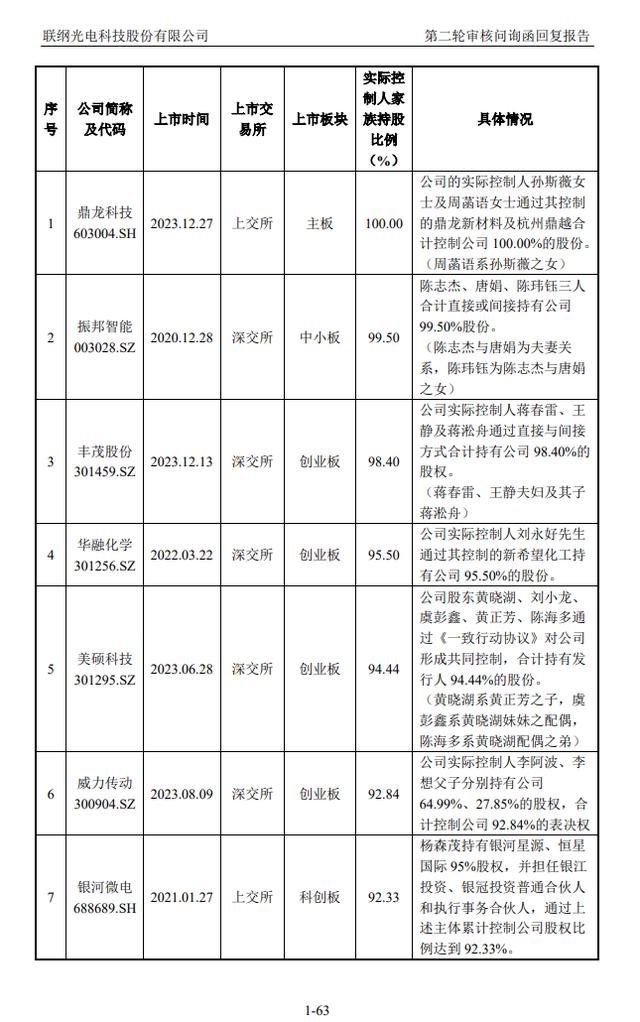 “但在这次回复中,联纲光电并没有说明此前没有披露各自配偶持股的原因,而是破天荒披露了近几年完成上市且实际控制人家族持股比例较高的案例情况。”深蓝财经指出。