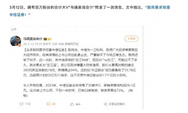 3月12日,拥有百万粉丝的会计大V“马靖昊说会计”转发了一则消息,文中指出,“股民要求彻查中信证券!”该帖中还具体提到,中信证券保荐业务乱象丛生,赚取了高额保荐利润,保荐项目的破发率却高得令人咂舌。