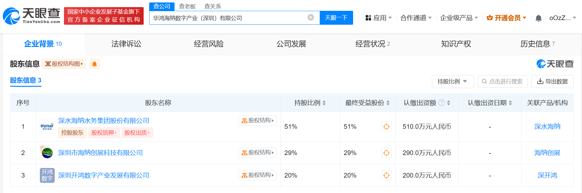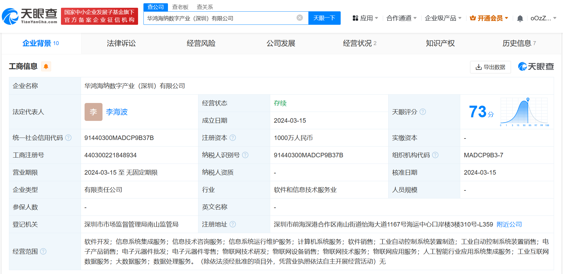 天眼查App显示,3月15日,华鸿海纳数字产业(深圳)有限公司成立,法定代表人为李海波,注册资本1000万人民币,经营范围含软件开发、工业自动控制系统装置制造、物联网技术研发、人工智能行业应用系统集成服务、工业互联网数据服务等。该公司由深水海纳(300961)、深圳市海纳创展科技有限公司、深圳开鸿数字产业发展有限公司共同持股。