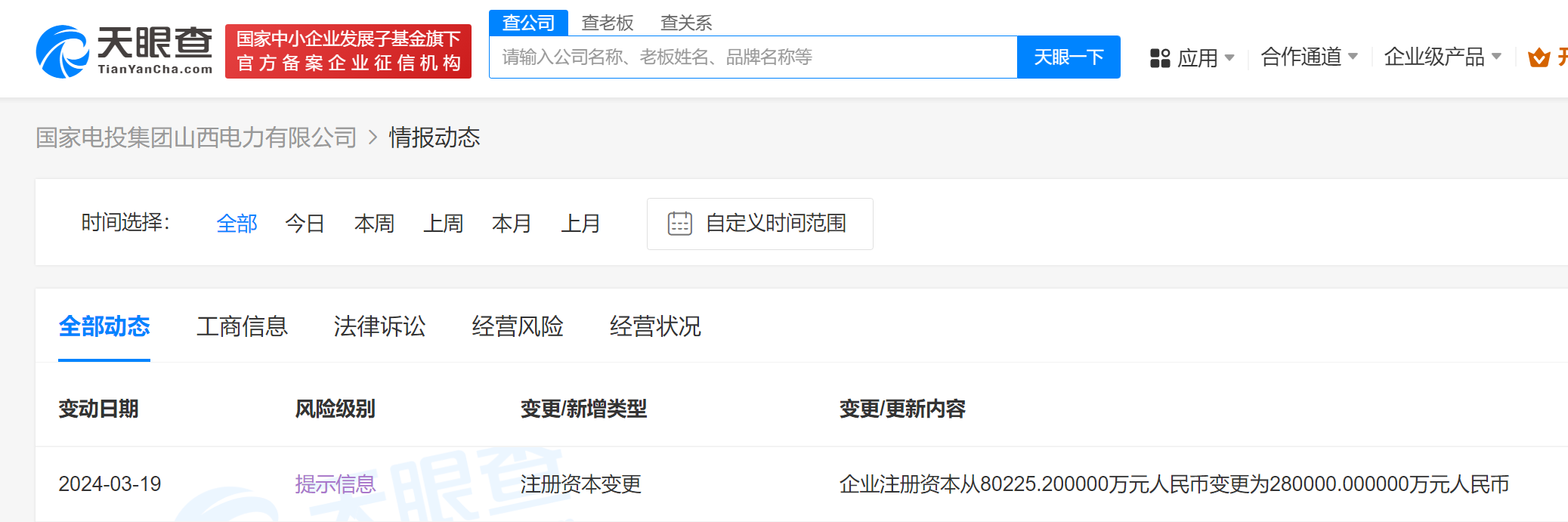 天眼查App显示,近日,国家电投集团山西电力有限公司发生工商变更,注册资本由约8.02亿人民币增至28亿人民币。该公司成立于2017年7月,法定代表人为周栋,经营范围含电力业务,电力供应,热力的开发建设、经营、生产及管理等。股东信息显示,该公司由中国电力国际发展有限公司全资持股。