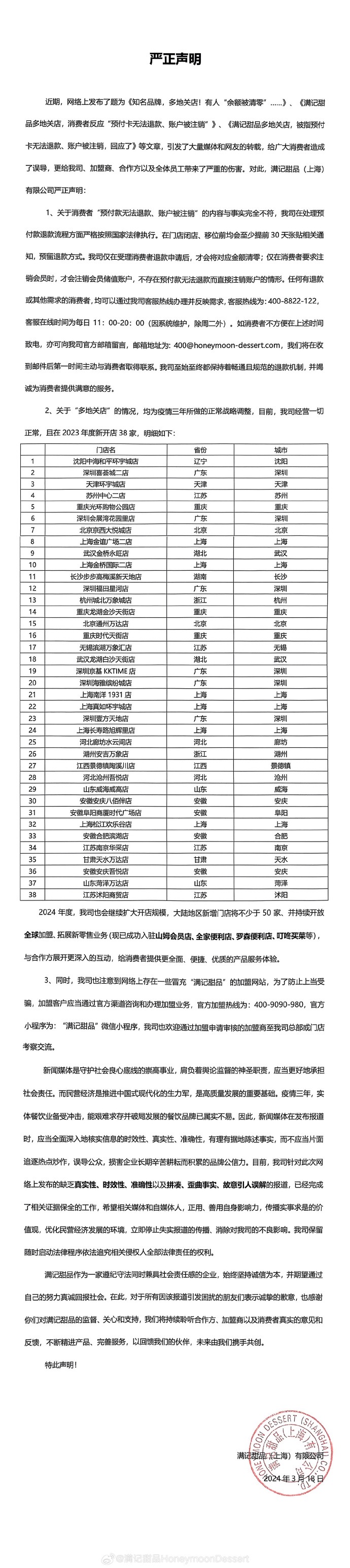 3月18日,满记甜品发布声明回应“预付款无法退款、账户被注销”及“多地关店”传闻。满记甜品指出,关于“多地关店”的情况,均为疫情期间所做的正常战略调整,目前,公司经营一切正常,且在2023年度新开店38家。2024年度,公司也会继续扩大开店规模,大陆地区新增门店将不少于50家。