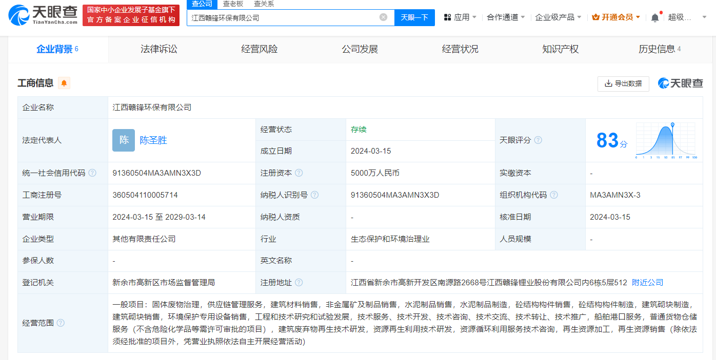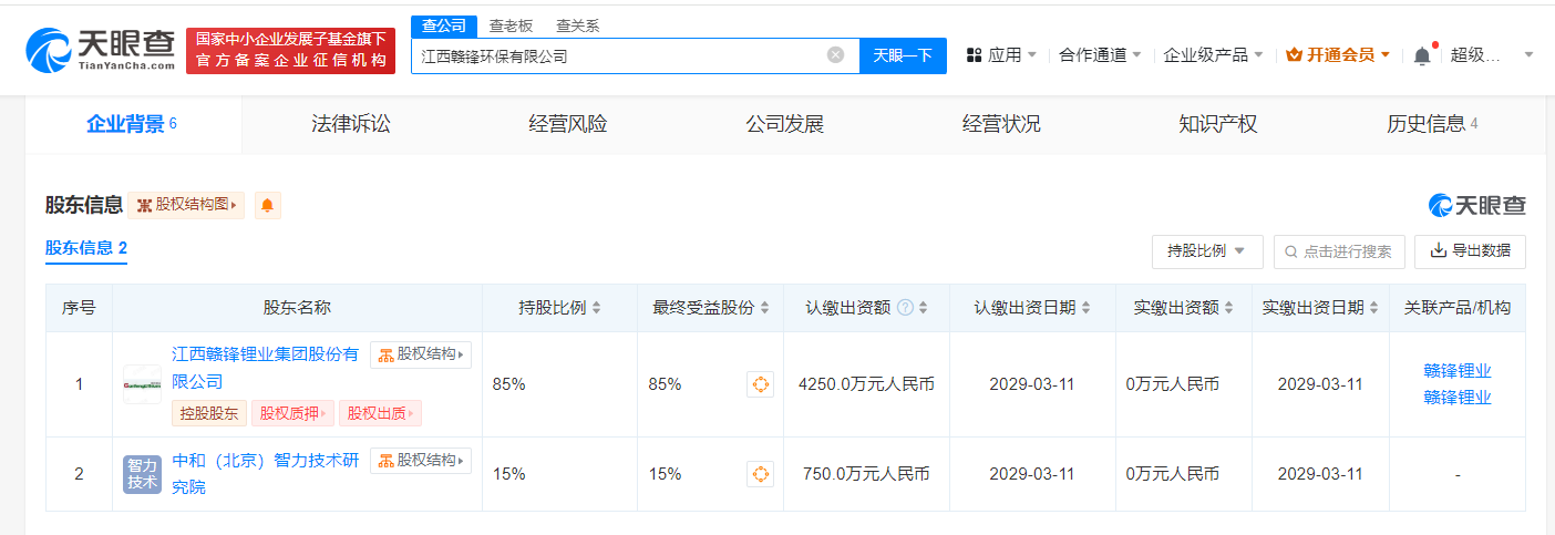 天眼查App显示,近日,江西赣锋环保有限公司成立,法定代表人为陈圣胜,注册资本5000万元,经营范围包括固体废物治理、供应链管理服务、资源再生利用技术研发、再生资源加工等。股东信息显示,该公司由赣锋锂业、中和(北京)智力技术研究院分别持股85%、15%。