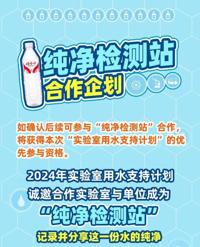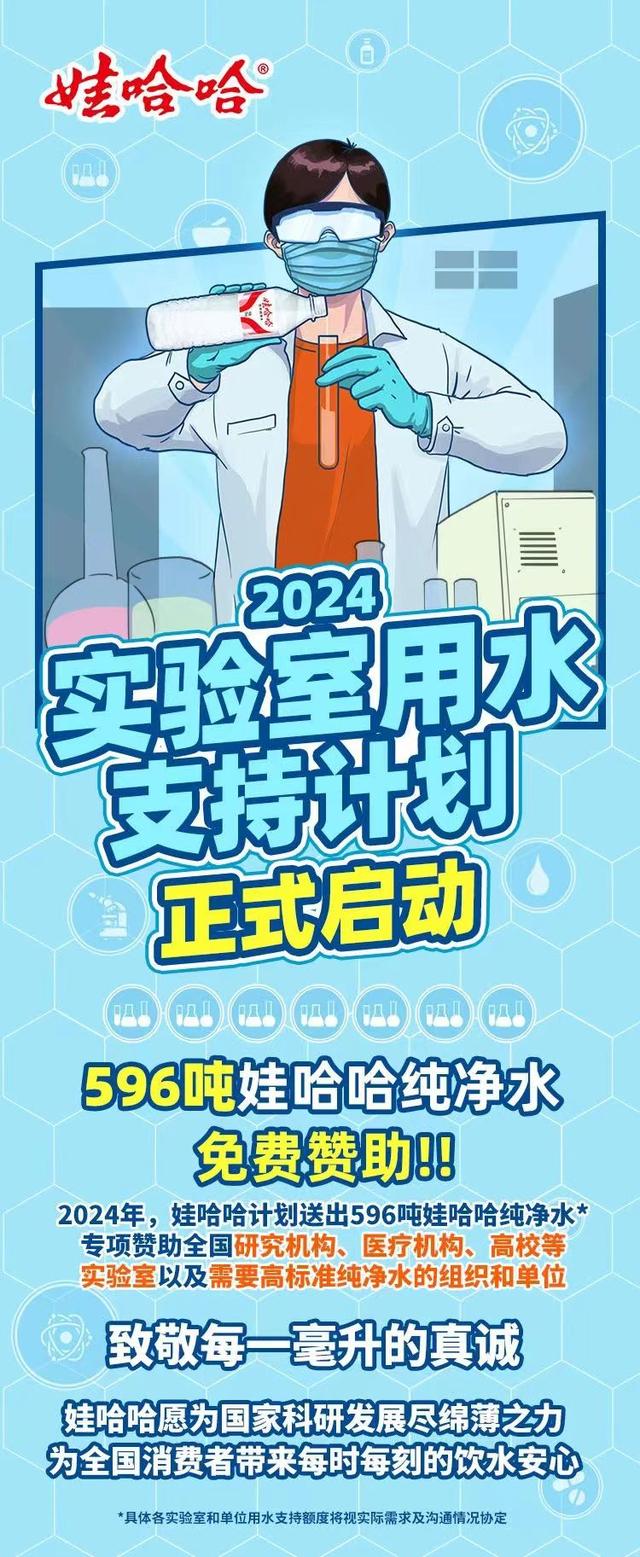“娃哈哈愿意为国家科研发展尽绵薄之力”。2024实验室用水支持计划中,娃哈哈计划送出596吨娃哈哈纯净水,专项赞助全国研究机构、医疗机构、高校实验室以及需要高标准纯净水的组织和单位。在日常工作环境中有需要高标准纯净水的组织或单位,涵盖食品生产、制药、医疗、保健、环境检测、生物科技、母婴护理等领域也是活动支持对象单位。