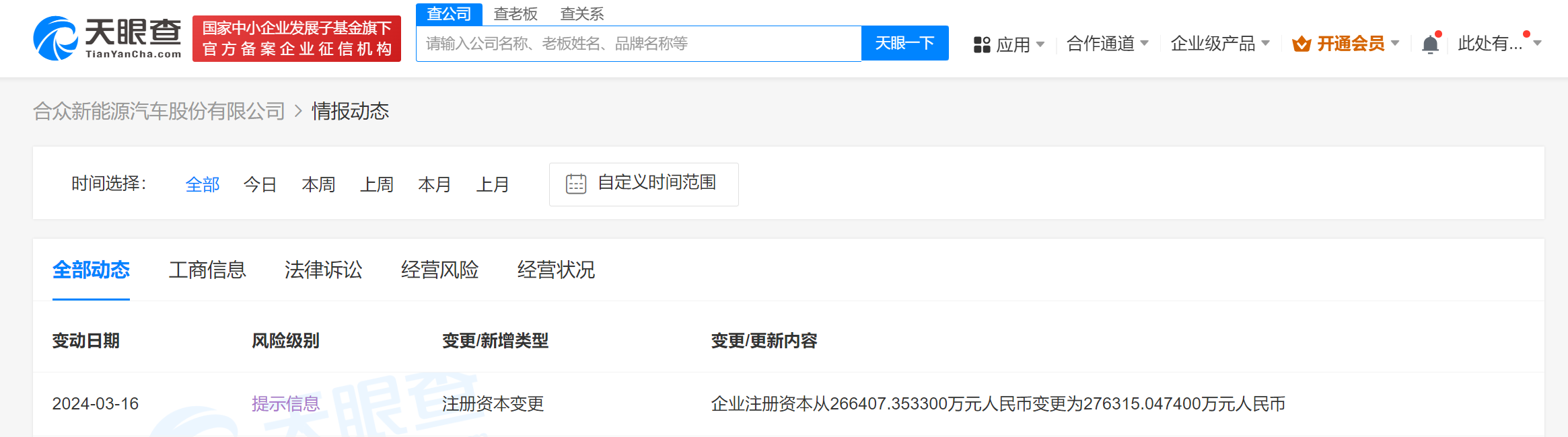 天眼查企业背景信息显示,近日,哪吒汽车关联公司合众新能源汽车股份有限公司发生工商变更,注册资本由约26.6亿人民币增至约27.6亿人民币。