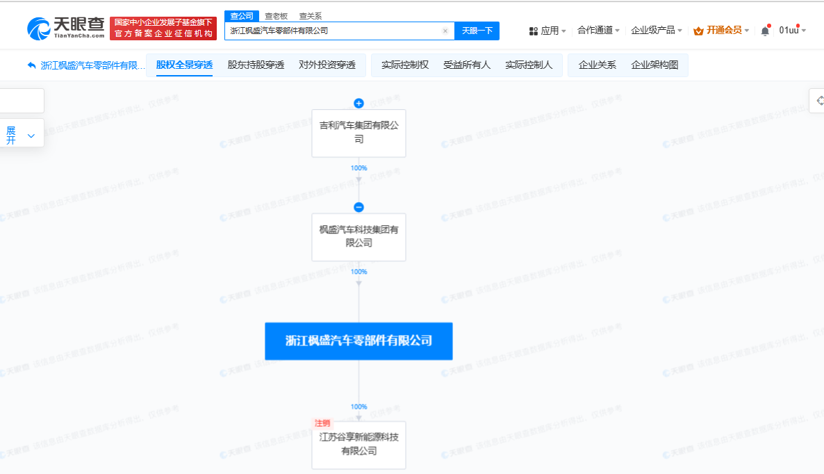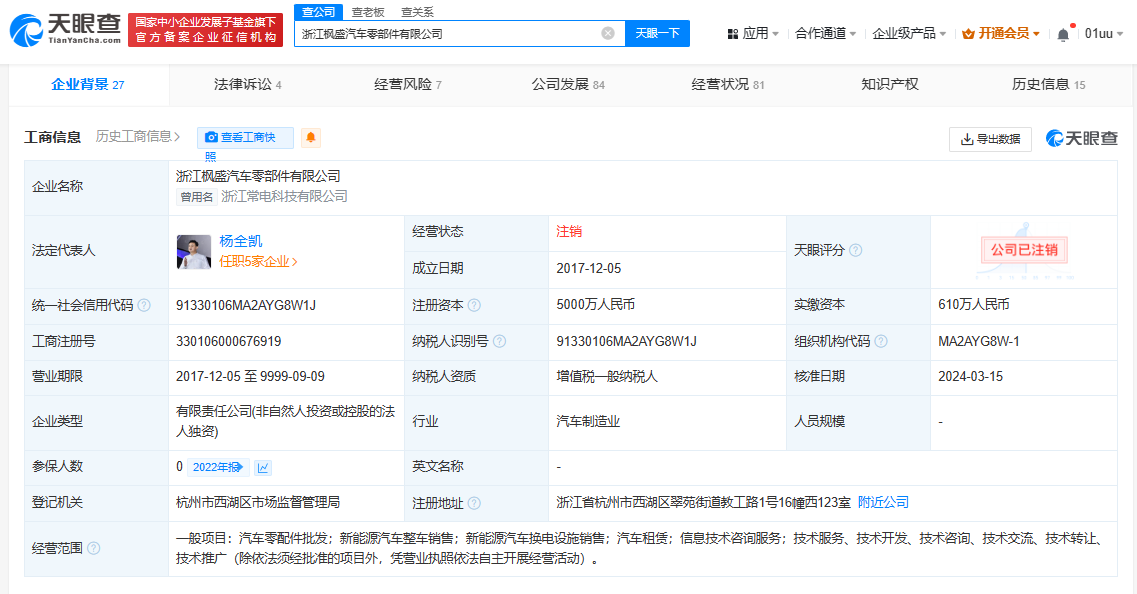 天眼查App显示,近日,浙江枫盛汽车零部件有限公司经营状态由存续变更为注销。该公司成立于2017年12月,法定代表人为杨全凯,注册资本5000万人民币,经营范围含汽车零配件批发、新能源汽车整车销售、新能源汽车换电设施销售、汽车租赁等。股权全景穿透图显示,该公司由枫叶汽车关联公司枫盛汽车科技集团有限公司全资持股,后者为吉利汽车集团有限公司全资子公司。