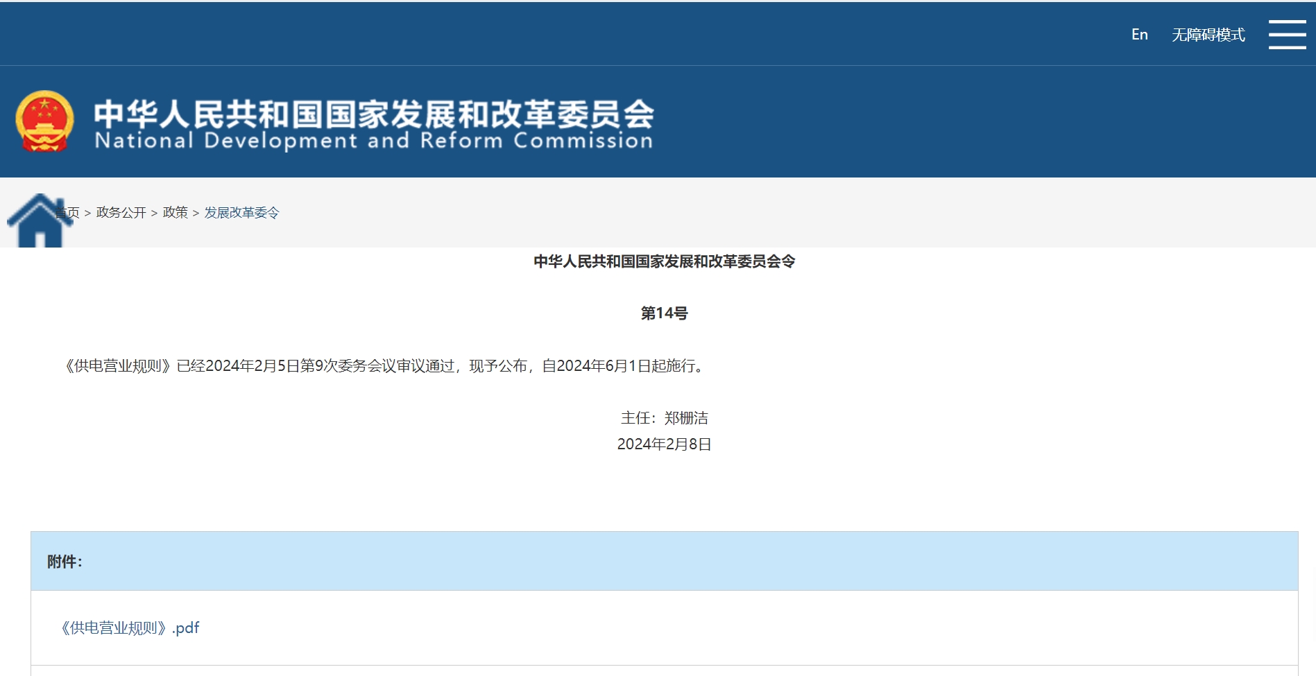 3月18日,中华人民共和国国家发展和改革委员会令第14号发布。《供电营业规则》已经2024年2月5日第9次委务会议审议通过,现予公布,自2024年6月1日起施行。