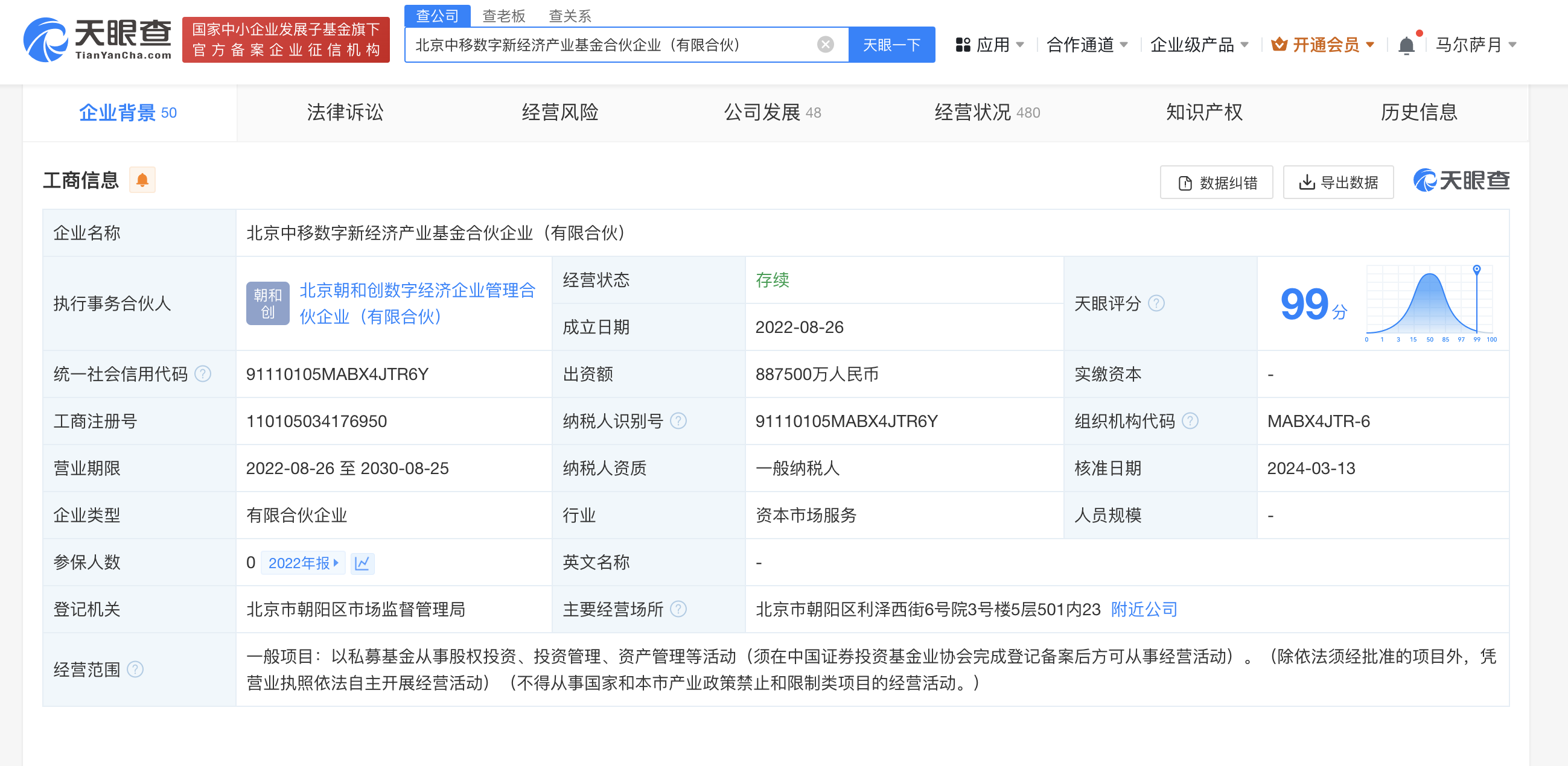 3月15日,北京中移数字新经济产业基金合伙企业(有限合伙)发生工商变更,注册资本由72.75亿人民币增至88.75亿人民币。