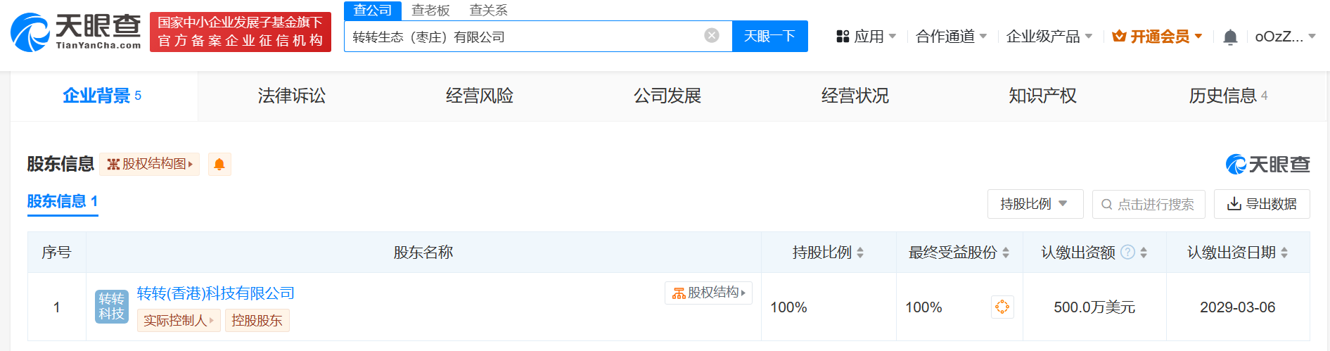 天眼查App显示,近日,转转生态(枣庄)有限公司成立,法定代表人为李瑞凌,注册资本500万美元,经营范围含生态恢复及生态保护服务、再生资源销售、电子产品销售、租赁服务、二手车经纪、新能源汽车整车销售等。股东信息显示,该公司由转转(香港)科技有限公司全资持股。