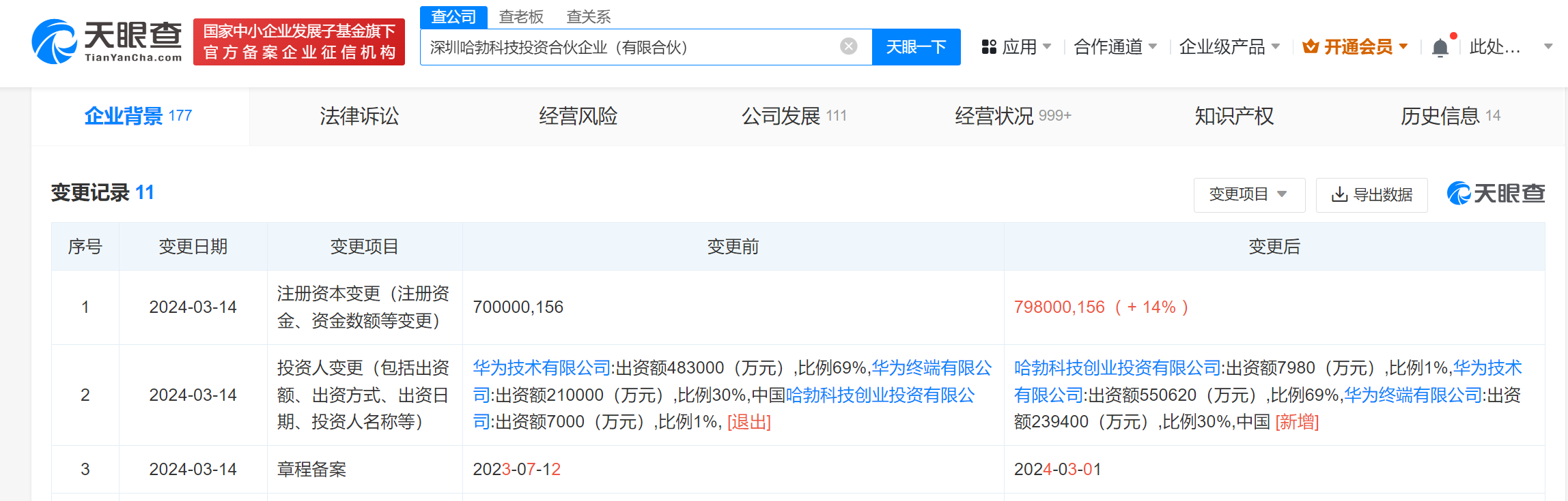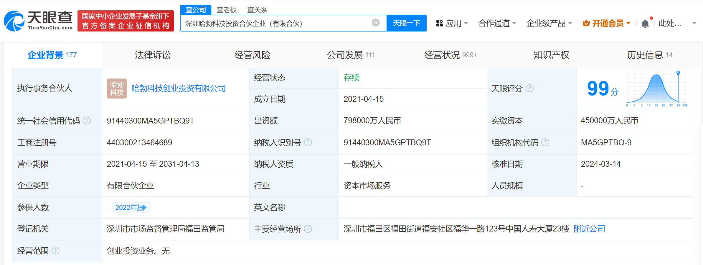 3月18日电,天眼查企业背景信息显示,近日,深圳哈勃科技投资合伙企业(有限合伙)发生工商变更,注册资本由70亿人民币增至79.8亿人民币。该合伙企业成立于2021年4月,执行事务合伙人为哈勃科技创业投资有限公司,经营范围为创业投资业务。合伙人信息显示,该企业由华为技术有限公司、华为终端有限公司、哈勃科技创业投资有限公司共同出资。