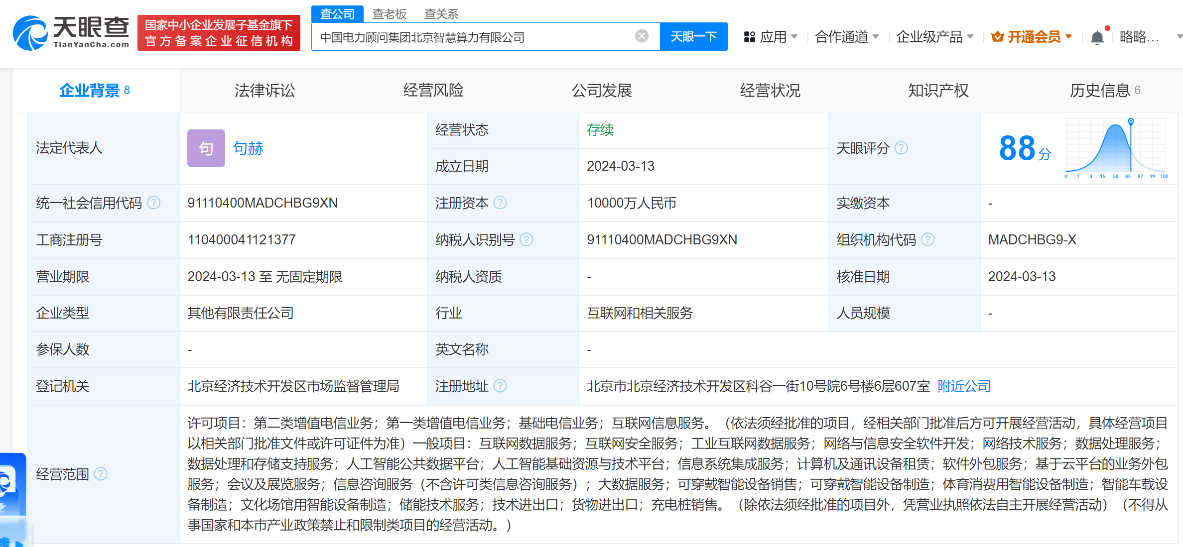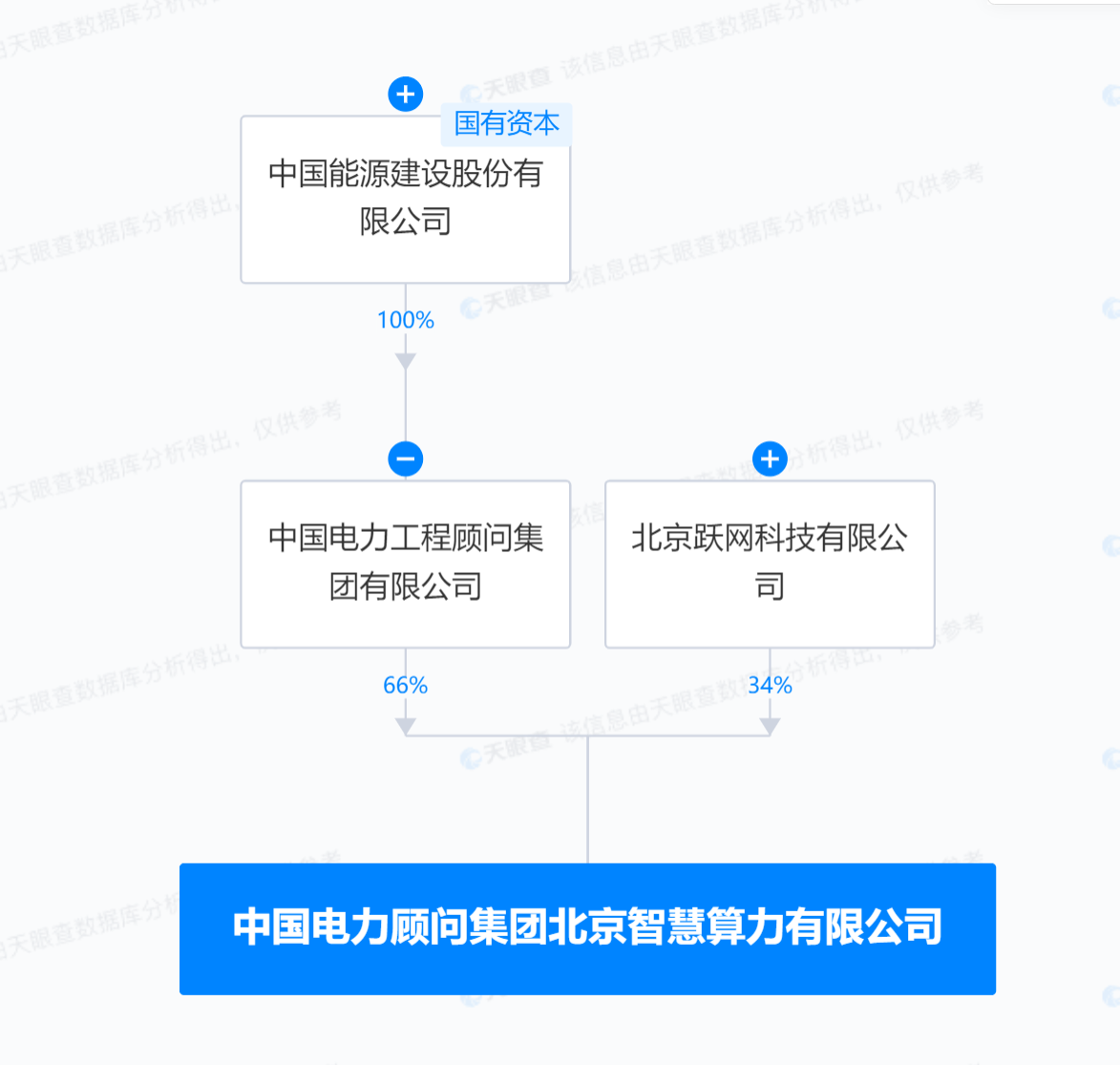 天眼查App显示,3月13日,中国电力顾问集团北京智慧算力有限公司成立,法定代表人为句赫,注册资本1亿人民币,经营范围含互联网数据服务、人工智能公共数据平台、人工智能基础资源与技术平台、可穿戴智能设备制造销售、储能技术服务、充电桩销售等。该公司由中国能建(601868)旗下中国电力工程顾问集团有限公司和北京跃网科技有限公司共同持股。