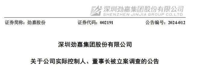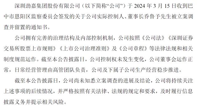劲嘉股份表示,公司于2023年5月31日收到于都县监察委员会签发的关于公司实际控制人、董事长乔鲁予被立案调查并留置的通知书。截至上述公告披露日,公司控制权未发生变化,公司董事会运作正常,公司财务及生产经营管理情况正常,公司管理层将加强管理,确保公司的稳定和业务正常进行。公司尚未知悉立案调查的进展及结论,公司将持续关注上述事项的后续情况,并严格按照有关法律、法规的规定和要求,及时履行信息披露义务并提示相关风险。