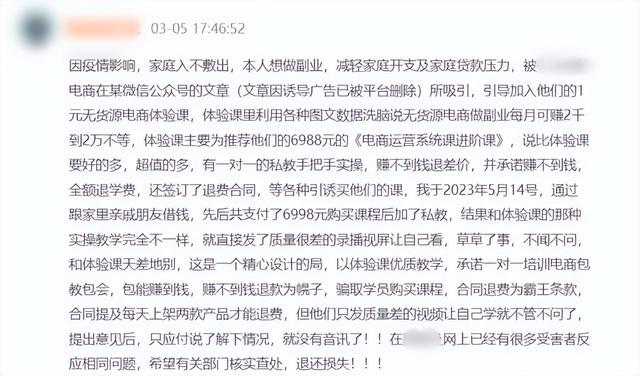 从投诉量较大的案例来看,多个创业小白称,某电商平台主播宣传自己做无货源电商6年开了19家店并示意大家购买课程一起创业。但在消费者购买后发现课程内容与宣传不符,按照订单界面显示7天内观看时长小于30分钟可退款,但客户申请退款时被拒。