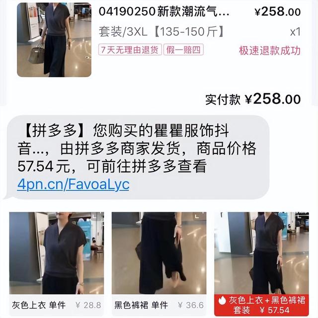 另有消费者告诉澎湃新闻,“之前在抖音某店铺下单女装,当时支付了258元,一天后收到来自拼多多商家的发货短信,短信提示购买商品由拼多多商家发货,商品价格57.54元。点击链接发现,正是在抖音店铺上购买的同款商品,价差接近5倍”。
