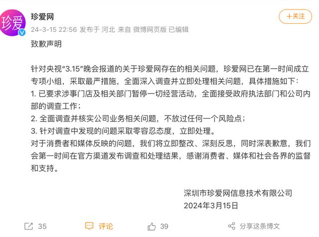 3月15日,珍爱网发布致歉声明:针对央视“3.15”晚会报道的关于珍爱网存在的相关问题,珍爱网已在第一时间成立专项小组,采取最严措施,全面深入调查并立即处理相关问题。