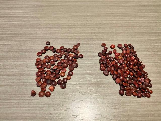 ▲左侧为扁豆染色而成的假酸枣仁,表皮有褶皱,右侧为正品酸枣仁,呈扁圆形,表皮较光滑。新京报记者 韩福涛 摄