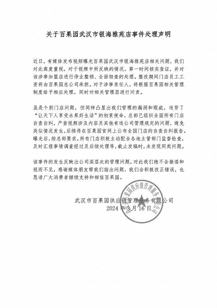 3月16日,百果园武汉官微发布《关于百果园武汉市银海雅苑店事件处理声明》称,近日,有媒体发布视频曝光百果园武汉市银海雅苑店相关问题,公司对此高度重视,对于视频中所反映的情况,已第一时间核实查证,并对该涉事加盟店进行停业整顿、全面彻查的处理。整改期间门店员工工资将由百果园总公司承担。对于涉事责任人,将根据百果园相关管理制度给予相应处理,同时对相关管理层进行问责。此外,声明提及,总部已组织全国所有门店自查自纠,严查视频涉及内容及其他有违公司管理规定的问题,避免类似情况发生,后续将在百果园官网上公布全国门店的自查自纠报告。