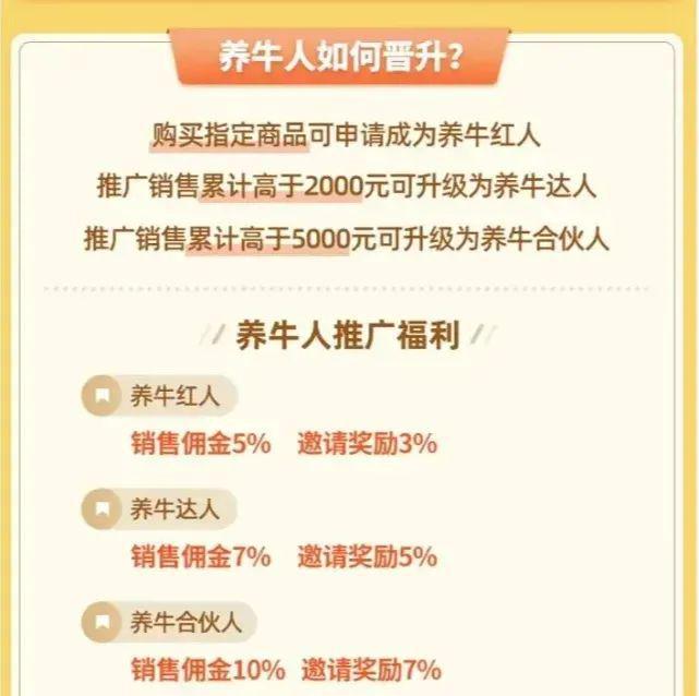 据多家媒体报道,当时消费者可以花2999元认养一头牛,获得牧场奶牛的“认养权”;或支付1万元成为“联合牧场主”,获得认养一头牛的所有权益,并享受牧场经营红利。如果朋友购买产品,参加“认养模式”的会员可以从中获得5%至10%的佣金,如果朋友接受邀请加入“养牛团队”,会员还能获得3%至7%的拉新奖励。该体系规则因与推广效果相关联,被外界质疑是否涉嫌传销。