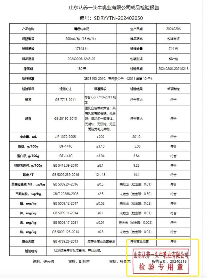 陈女士对这一回应并不满意,她对记者表示,作为有着多年喝奶习惯的内蒙古人,此前未在其他品牌牛奶中喝出类似不明物质,也不像是奶皮;家里开着暖气,也不存在低温影响产品的因素;此外,令陈女士感到滑稽的是,为了证明产品没有质量问题,认养一头牛客服提供了一份产品检测报告,但该报告由公司本身开具,而非第三方权威机构。