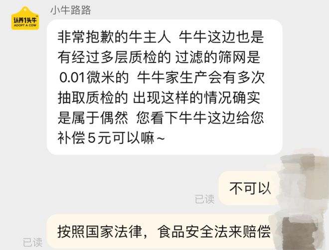 察觉到陈女士态度比较坚定,认养一头牛更换了一位品牌专员与其进行沟通,但对方只同意退款或退货,不同意消费者提出的赔偿诉求,坚持表示“这不属于生产过程中的问题”。