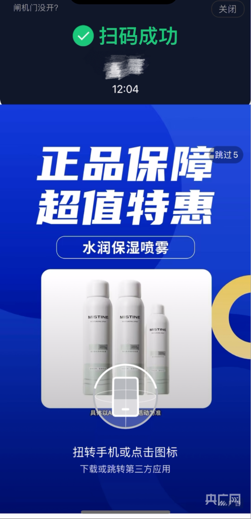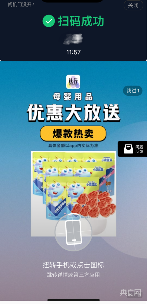 随后,记者对亿通行App开展测试发现,在乘坐地铁或公交刷码后,均有跳转第三方应用的广告,广告上标有“扭转手机或点击图标下载或跳转第三方应用”的提示,大概有5秒钟倒计时可跳过广告。记者模拟了日常乘客的使用习惯,即刷码后将手机揣兜、放包里以及随手拿着等使用场景,均会出现晃动手机而误触广告的情况,必须退出跳转广告界面,点击返回,才能正常使用App。值得注意的是,乘客一般在刷码进出站后,大多会走路去乘地铁或走到公交车的座位上,这时由于走动原因,界面将直接跳转到广告页面,未留给乘客过多的选择时间。