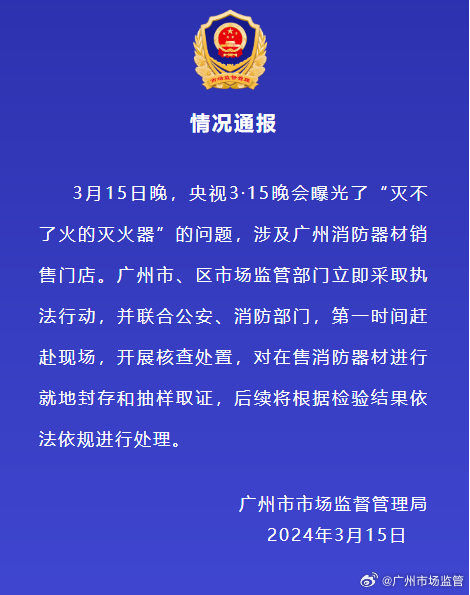 3月15日晚,广州市市场监督管理局发布情况通报:3月15日晚,央视3.15晚会曝光了“灭不了火的灭火器”的问题,涉及广州消防器材销售门店。广州市、区市场监管部门立即采取执法行动,并联合公安、消防部门,第一时间赶赴现场,开展核查处置,对在售消防器材进行就地封存和抽样取证,后续将根据检验结果依法依规进行处理。