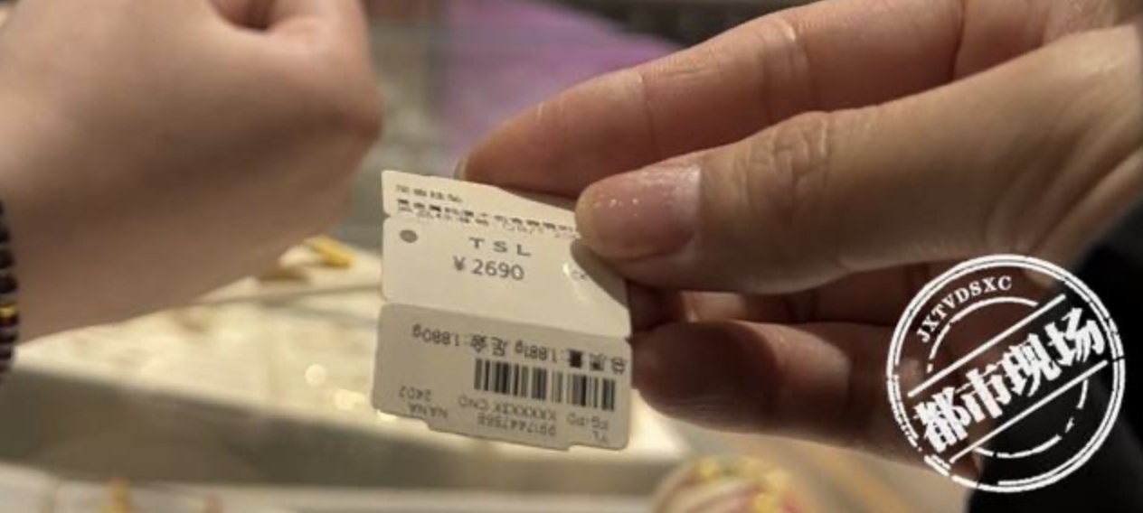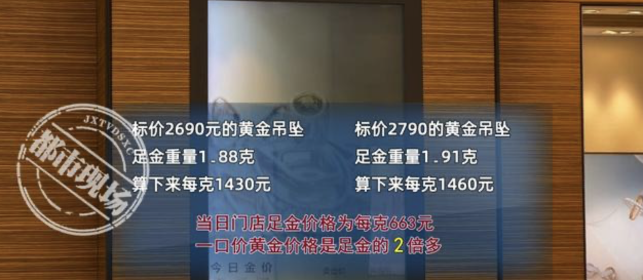 3月9日下午,门店接待了一位买黄金饰品的男性消费者,整个30分钟的销售过程当中,店员都没有向对方清晰地计算过克重单价。店员推荐的一款标价2690元的黄金吊坠,足金重量1.88克,算下来每克1430元;一款标价2790元的黄金吊坠,总重量1.91克,算下来每克1460元。而当日门店足金价格为每克663元,也就是说,一口价黄金的价格是足金的两倍多。