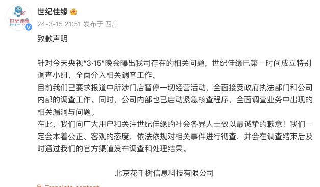 3月15日晚,世纪佳缘发布致歉声明:针对今天央视“3·15”晚会曝出我司存在的相关问题,世纪佳缘已第一时间成立特别调查小组,全面介入相关调查工作。目前我们已要求报道中所涉门店暂停一切经营活动,全面接受政府执法部门和公司内部的调查工作。同时,公司内部也已启动紧急核查程序,全面调查业务中出现的相关漏洞与问题。
