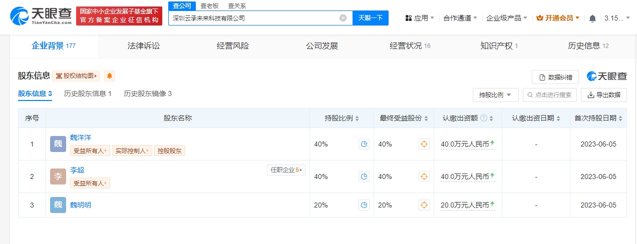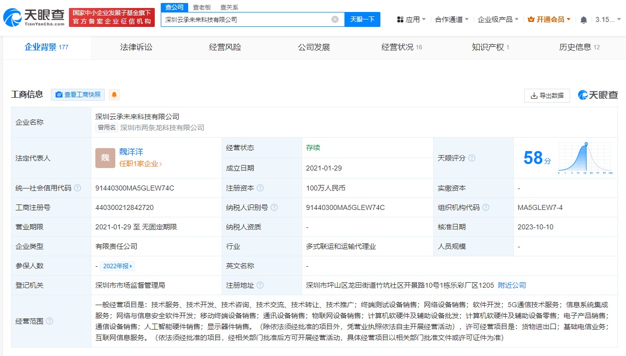 天眼查App显示,深圳云承未来科技有限公司成立于2021年1月,法定代表人为魏洋洋,注册资本100万人民币,经营范围包括信息系统集成服务、网络与信息安全软件开发、人工智能硬件销售等,由魏洋洋、李超、魏明明共同持股。知识产权信息显示,该公司去年11月曾申请注册1枚“壹峯云”商标。