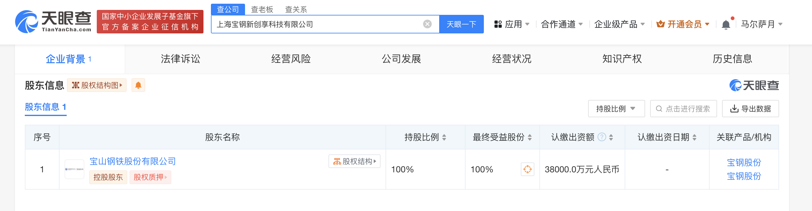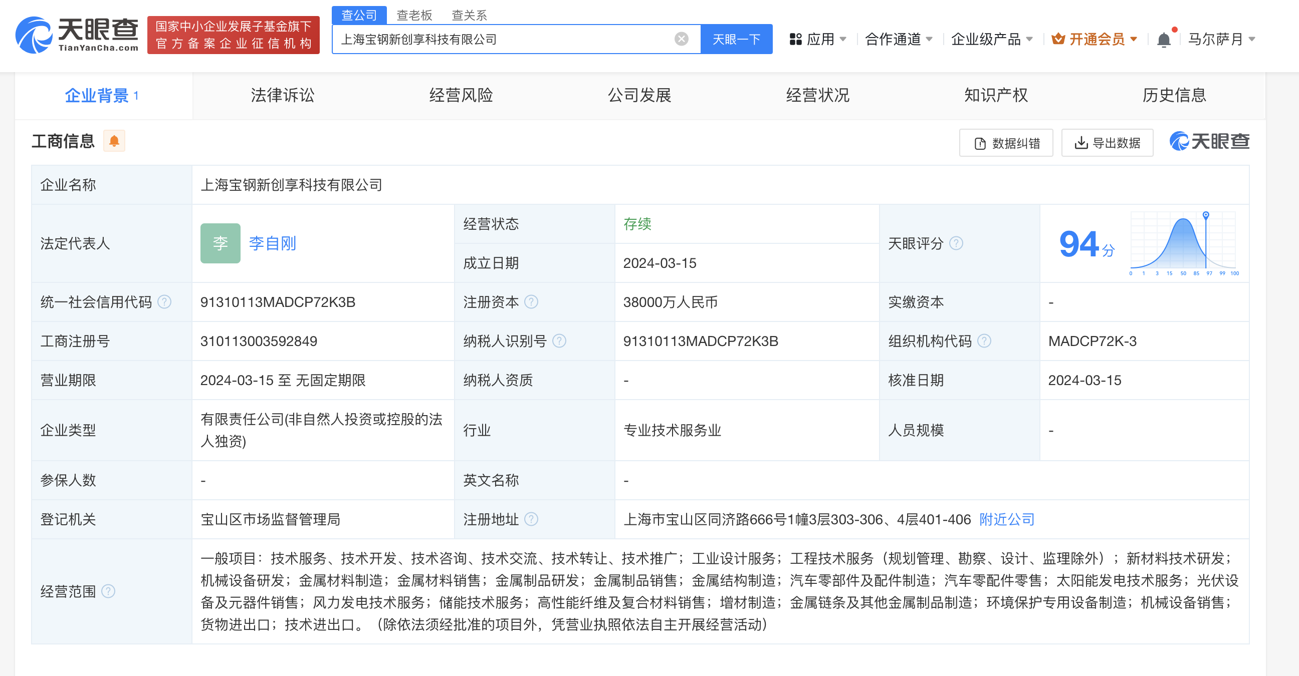 企查查APP显示,近日,上海宝钢新创享科技有限公司成立,法定代表人为李自刚,注册资本3.8亿人民币,经营范围含工业设计服务、新材料技术研发、金属结构制造、汽车零部件及配件制造、太阳能发电技术服务、光伏设备及元器件销售、货物进出口等。股东信息显示,该公司由宝钢股份(600019)全资持股。