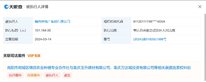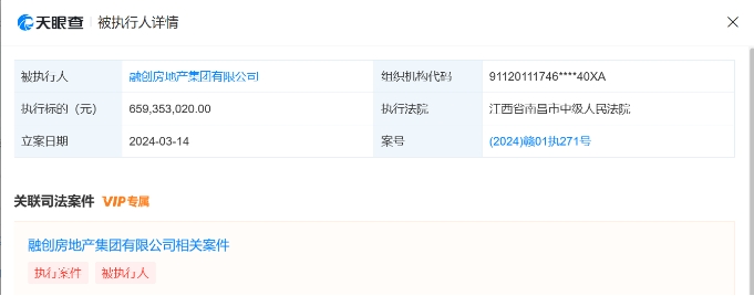 天眼查法律诉讼信息显示,3月14日,融创房地产集团有限公司新增4条被执行人信息,执行标的合计9.4亿余元,涉及票据追索权纠纷等案件,部分案件被执行人还包括重庆万达城投资有限公司、重庆驰旭混凝土有限公司,执行法院包括江西省南昌市中级人民法院、重庆自由贸易试验区人民法院、大连市沙河口区人民法院。