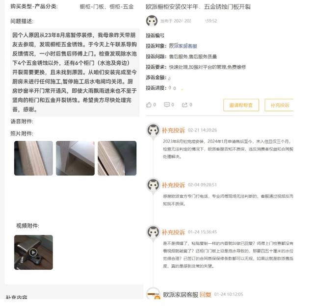 “2023年8月购买的欧派橱柜,不到五个月就出现了五金件锈蚀、柜门开裂等严重质量问题,多次联系欧派售后部门,直到现在也没有解决问题。”这是消费者全先生选择欧派后的遭遇,他对欧派很失望,为此他向本报进行了投诉。