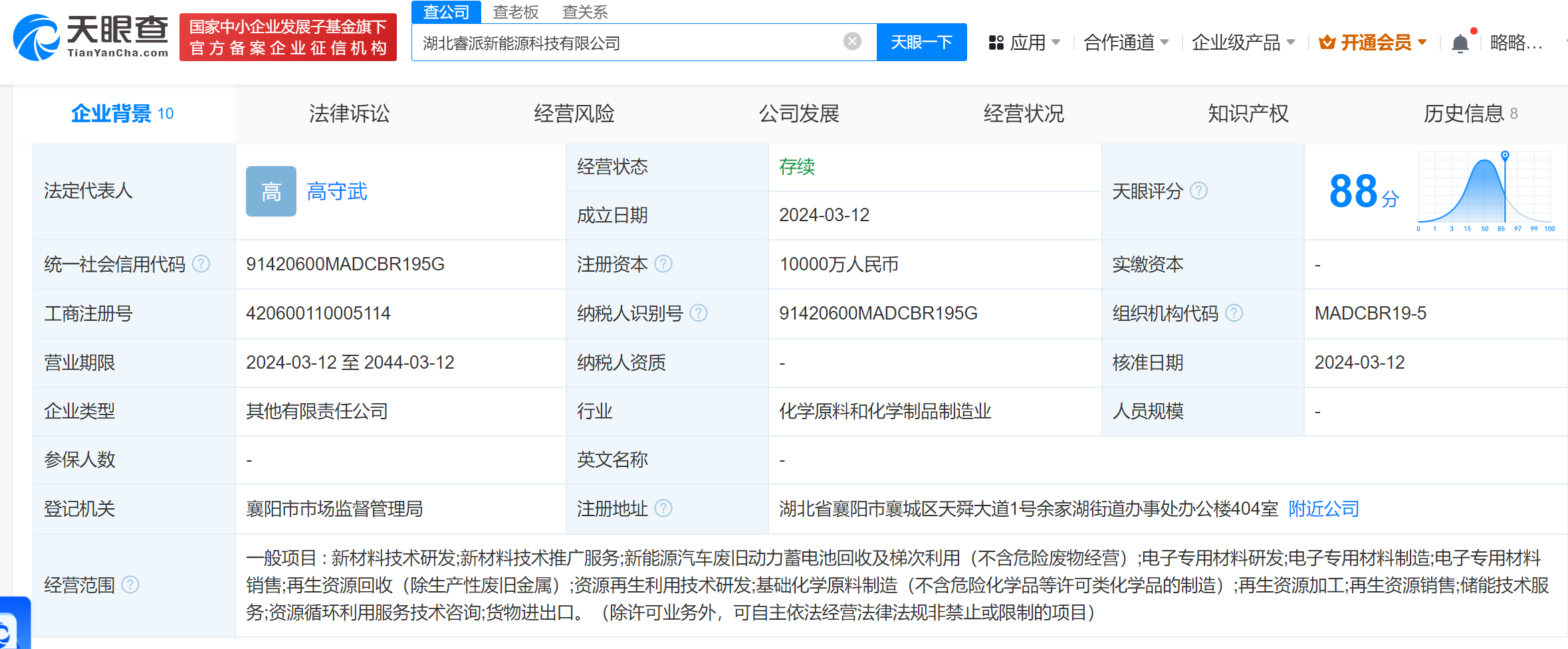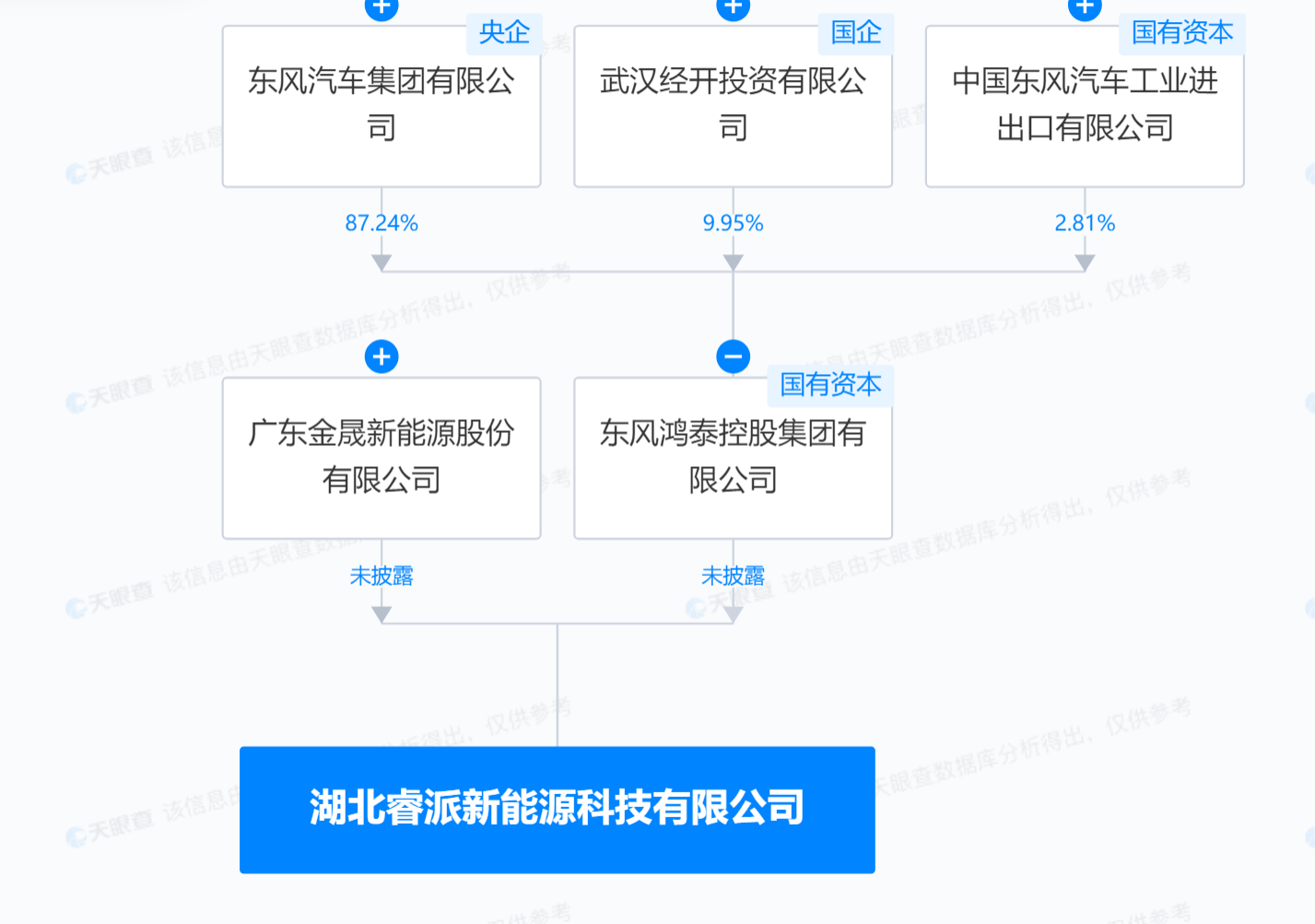 天眼查显示,近日,湖北睿派新能源科技有限公司成立,法定代表人为高守武,注册资本1亿人民币,经营范围含新材料技术研发和推广服务,新能源汽车废旧动力蓄电池回收及梯次利用,电子专用材料研发、制造、销售,储能技术服务等。股权全景穿透图显示,该公司由东风汽车旗下东风鸿泰控股集团有限公司和广东金晟新能源股份有限公司共同持股。