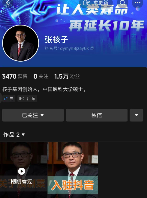 今年3月1日,张核子发布视频宣布入驻抖音,账号简介为核子基因创始人,中国医科大学硕士。截至目前张核子已有1.5万粉丝,但评论区多为负面言论。另外,在其账号背景图上还可以看到“让人类寿命再延长10年”宣传标语。