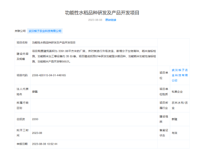 规划的建设内容显示,项目将购置建筑面积为3391.88平方米的厂房,并对其进行升级改造,新增分子生物育种、稻米指标检测、功能稻米加工等设备约35台/套,项目建成后预计年研发功能型水稻品种、功能稻米功能性指标检测、功能稻米产品开发等500次。