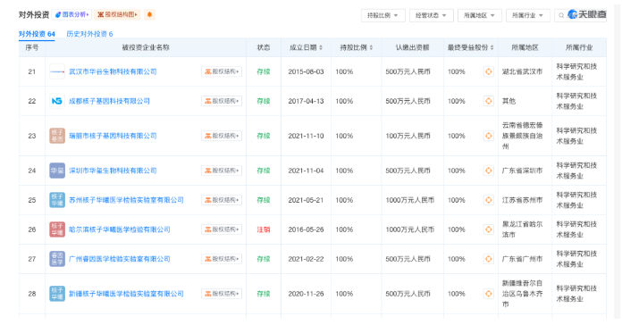 记者梳理工商信息发现,张核子的核子集团旗下有超过60家子公司,其中不少随着公司核酸业务的发展快速成立后又被快速注销。2023年成立的武汉核子农业可以说是核子集团旗下首家涉足食品领域的公司。