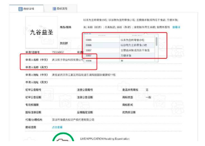 此外,去年8月武汉核子农业还申请注册了一则名为“九谷益圣”的商标,分类为“方便食品”,商品主要包括方便米饭、米粉、由米制成的冻干食品、以谷物为主的零食小吃、食物制作用生米糊、食用芳香剂等。