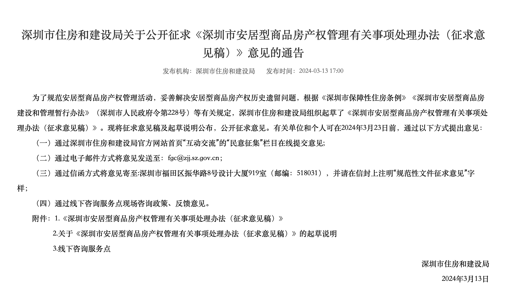 3月13日,深圳市住房和建设局发布关于公开征求《深圳市安居型商品房产权管理有关事项处理办法(征求意见稿)》(以下称“《征求意见稿》”)通告,明确深圳安居型商品房产权管理有关事项。