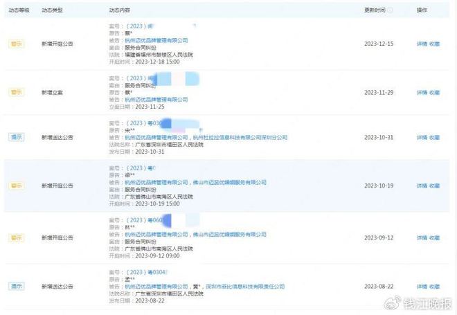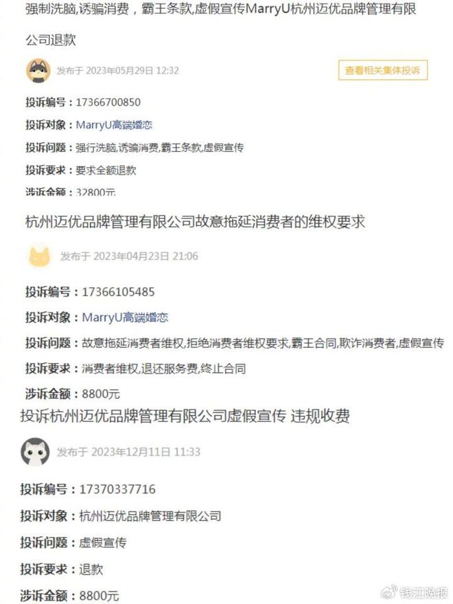 根据相关搜索显示,在某消费者服务平台,有多起有关杭州迈优的投诉,内容大多涉及虚假宣传、维权退费等。而在某企业信用查询平台上,显示杭州迈优品牌管理有限公司涉及服务合同纠纷有多起作为被告的诉讼案件。
