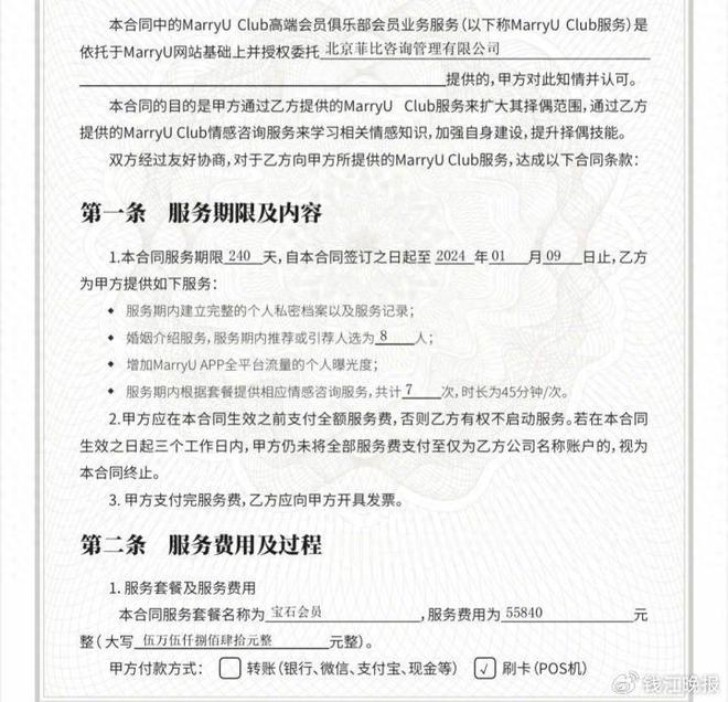 去年5月,钱女士与名为MarryU婚恋平台的北京线下门店签订了一份服务金额为55840元的会员服务合同,约定服务期内为其推荐8位相亲对象,提供7次情感咨询服务。