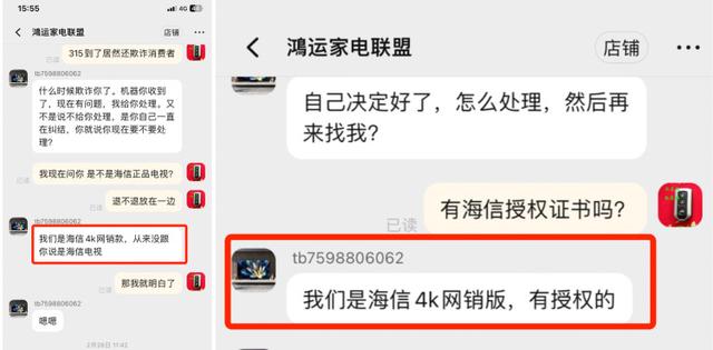 据夏先生提供的电视机画面及相关购买、沟通页面截图显示,开机后能清晰看出屏幕上显示异常。对于是否为正品海信电视机,商家称是海信4k网销款,从来没说是海信电视,是有授权的,但要求其提供授权时,被商家拒绝。对于夏先生提出的退款问题,该商家表示夏先生将商品邮寄后,他们会向淘宝店铺充值保证金,再通过淘宝原路退回到夏先生的账户。“所有申请渠道都关闭了,怎么退钱?”夏先生提出质疑。