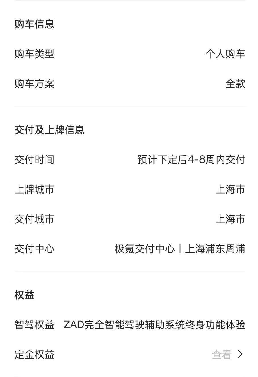 按照极氪的购车流程,消费者先支付5000元定金,然后车辆安排生产,生产完成便可支付尾款,待车辆合格证通过后,可以申请上牌额度,通过后即可交车。