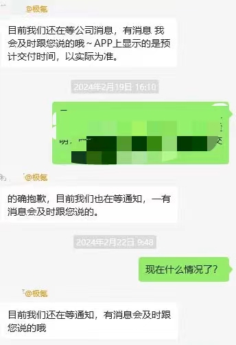 地标目录到底进了吗?一位消费者称,早在2月2日,就有极氪工作人员通知上海地标目录已经通过,2月5日左右通知车架号出来了,2月7日左右,通知合格证也下来了。车辆早已运输至门店,他也已经验过车辆。可至今该车仍没交付。为了探求答案,他向12345市民服务热线反映交付延迟问题。2月19日,接到12345市民服务热线投诉单后,市新能源办电话回复了他。在通话中,工作人员询问消费者姓名,进行查询后明确表示,厂商目前还没有提交车辆信息确认。工作人员称,在通知合格证已经下来的情况下,如果地标目录通过,可以直接提交车架号,不存在其他需要审核的步骤。而厂商无法提交车架号,大概率意味着地标目录还未能通过。“不然您有合格证的前提下,不可能提交不上来的。我们没有这种情况的。”
