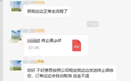 可经由一个多月的变故后,不少消费者已转变主意,不打算购买了。于是,多日拒付尾款的消费者,收到了来自极氪公司的提车催促函,要求按日期支付尾款,否则将被终止购车协议,定金不予退还。有的超期的消费者还收到了订单终止函,购车订单被自动取消,同样未退还定金。