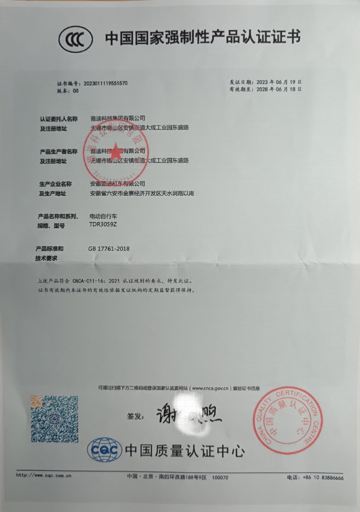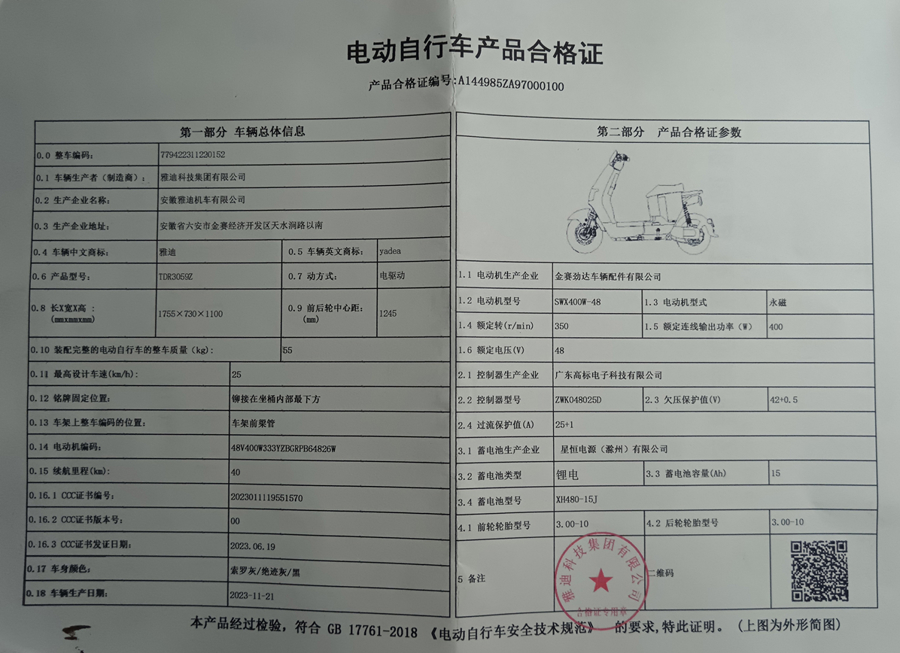 很快,一旁的打印机吐出了一张用特殊纸张制作的崭新的合格证。对方仔细看了看,猛然想起了什么,急忙又在电脑里的“合格证”上修改数据,边改边心有余悸地说,因为改装的黑色锂电池容量是15Ah,万一被验出与“合格证”上填写的“12”不符,会前功尽弃的。对方随即对与此关联的“额定转”、“蓄电池型号”等数据重新做了调整。打印机又吐出了一张蓄电池容量15Ah等最新修改过的,盖有雅迪科技集团有限公司合格证专用章的新的合格证。该合格证做了双面打印,另一面是“中华人民共和国电动自行车合格证”。