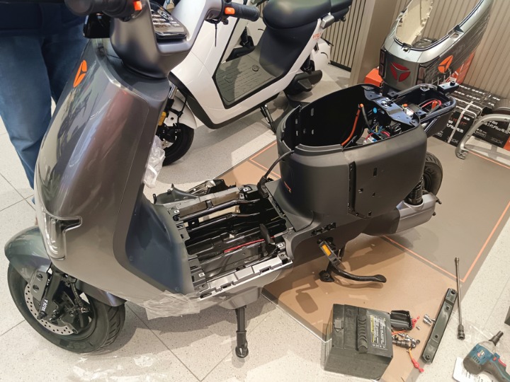 很快,店堂一角被挪为“修理车间”。对方先用螺丝刀,将新车前部下方盖板内的所有固定螺丝全部起出。掀开盖板后,记者看到凹槽内,满满当当连接有6个长方形的黑红相间电池。对方松开连接线路后,将每个标称电压12V的电池一一掏出,置于地面。