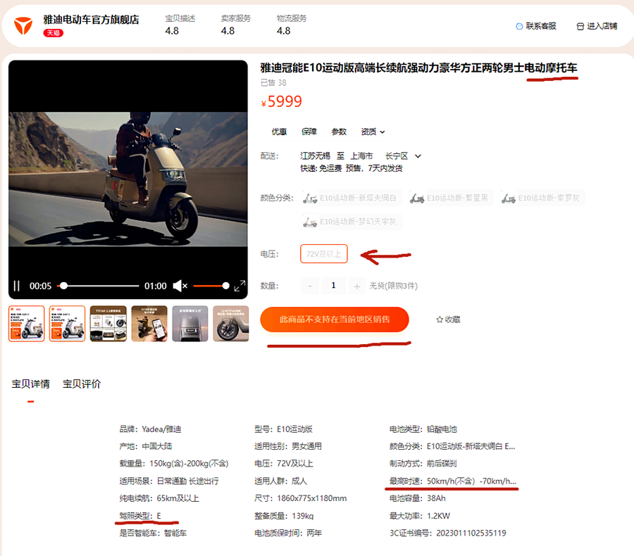 为获取上述车型真实信息,记者登录“雅迪”官网,点击“在线购买”后即被导入“天猫”雅迪电动车官方旗舰店。在“冠能系列”所有产品中,记者看到被称作“更高端的长续航电动”的“探索E10”只有运动、旗舰两个版本,不仅全部显示“电压72V及以上”,还都被归入“电动摩托车”,开车需要驾照,且“此商品不支持在当前地区(上海)销售”。