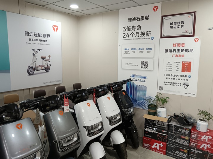 武夷路776号“雅迪”授权专卖店、授权体验店内待售的“冠能探索E10 lite-D”。