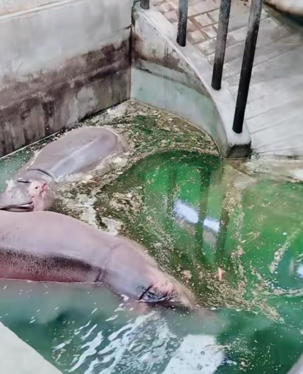 3月10日,有网友发视频称,沈阳森林动物园内河马居住的水池颜色发绿。视频显示,一名游客捂住鼻子离开。